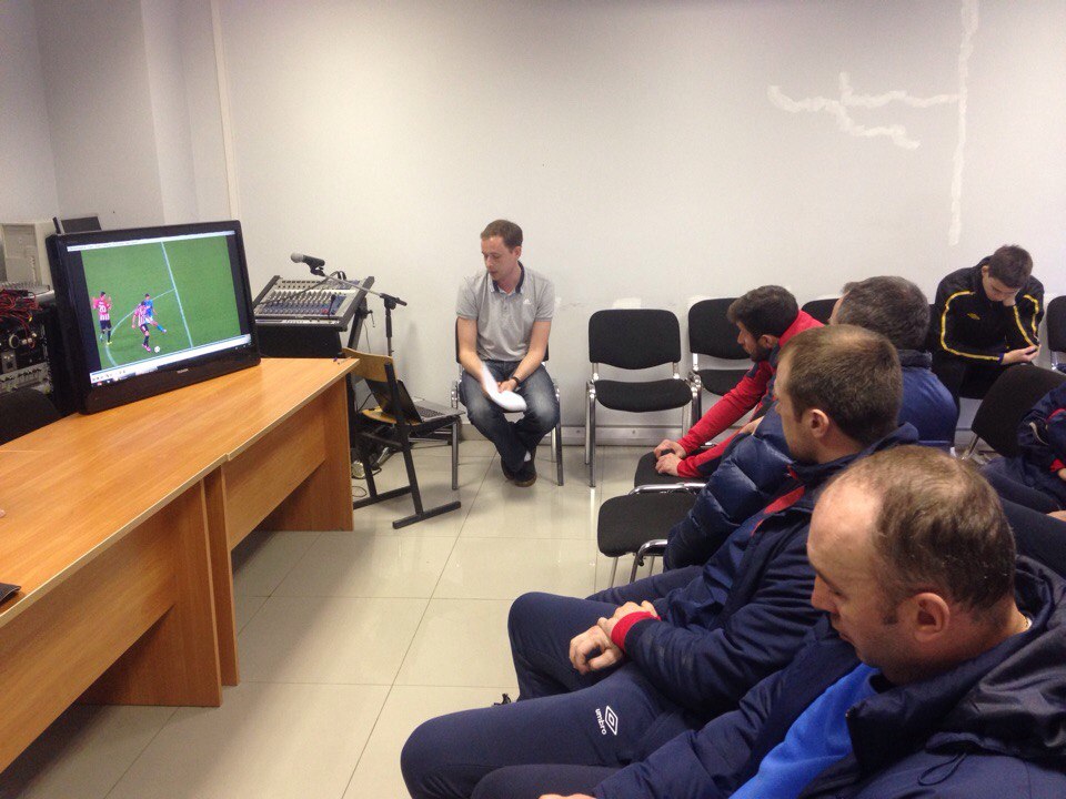 Перед началом запланированной тренировки было принято решение провести отдельное занятие для футболистов и тренерского штаба нашей команды. Виталий Мешков рассказал о последних изменениях в трактовках игровых эпизодов, с помощью видеоматериалов объяснил разницу в принятии решений в различных моментах, ответил на вопросы игроков и тренеров. В итоге занятие продлилось значительно дольше, чем планировалось, так что пришлось даже немного перенести начало тренироки.